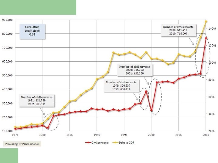 1980 -2010: the road to default l 1980 public debt: 28% of GDP l 1990 public debt: 89% of GDP l 2009 public debt: 142. 8% of GDP – almost 165% in late 2012 l 1980 public deficit: <3% of GDP l 2009 public deficit: 15. 4% of GDP l 1980 government spending: 29% of GDP l 2009 government spending: 53. 1% of GDP
