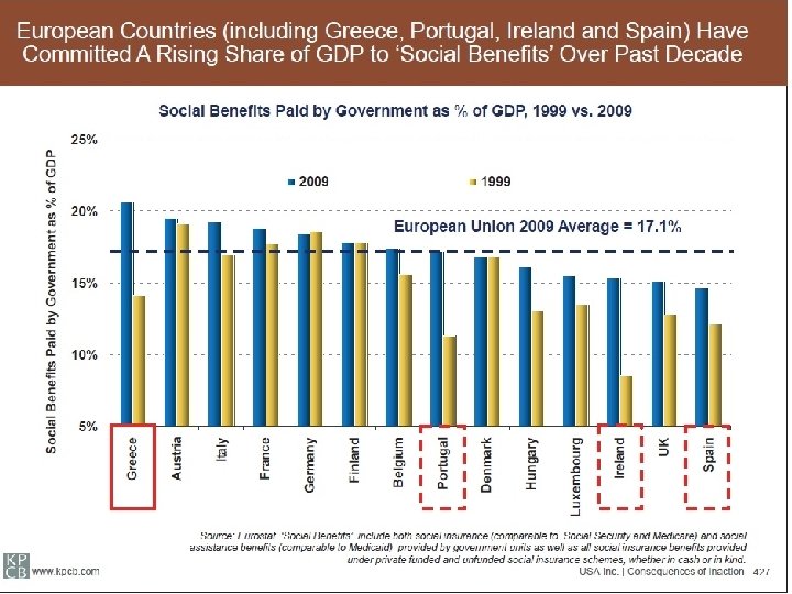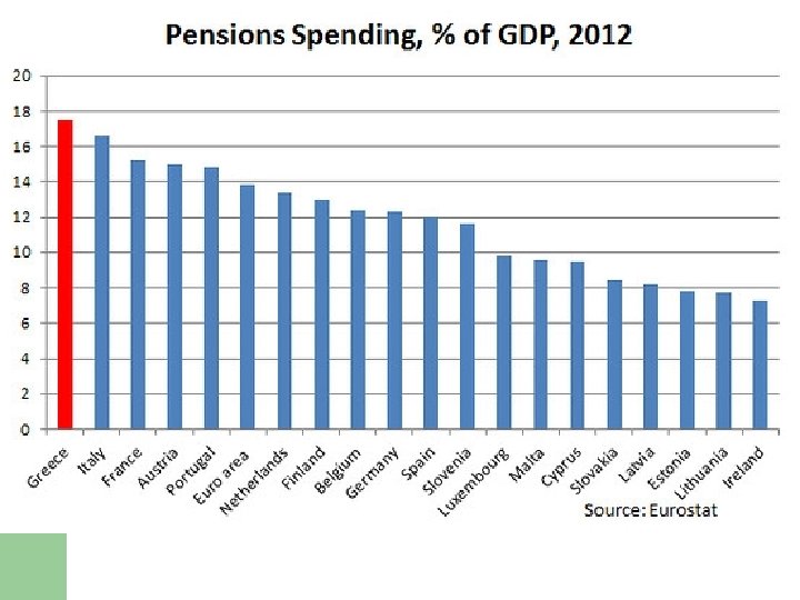 A bloated Welfare State… l Social benefits to households (percentage of GDP) – – – from 22. 0% (2004) to 26%. 4 (2008) to 29. 0% (2009) (from 2004 to 2009 “conservatives” ruled Greece) half of it went to pensions l l “social transfers” (subsidies to the pension funds of powerful professional groups) equals 52% of this half – 6. 34% of GDP in 2008. EC pension projections (2009) – – – EU-27: 12. 3% (2040) – 12. 5 (2060) Ireland: 6. 4% (2040) – 8. 6% (2060) Portugal: 12. 5% (2040) – 13. 4% (2060) Spain: 13. 2% (2040) – 15. 1% (2060) Greece: 21. 4% (2040) – 24. 1% (2060)