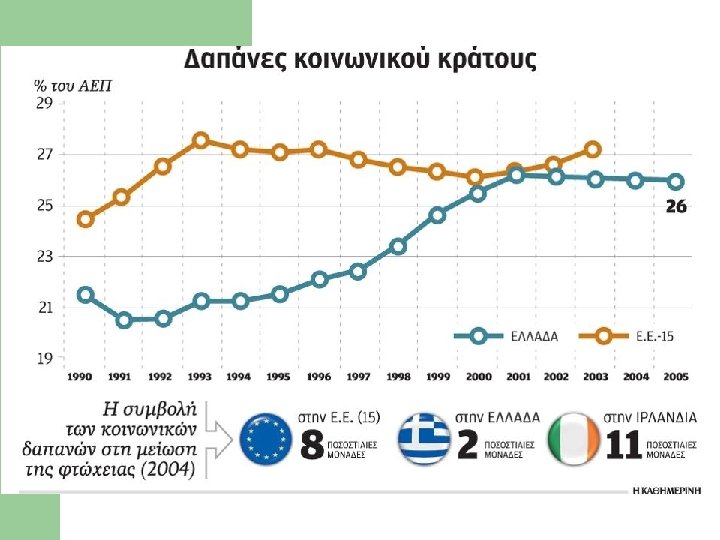 An inefficient welfare state l The indicator of the efficiency of social benefits in alleviating property is the worst in the E. U. (13%, where the EU average is 35% and some Scandinavian countries were as efficient as 70%!). l In 2002 the indicator was a poor 4% with a EU average of 31%.
