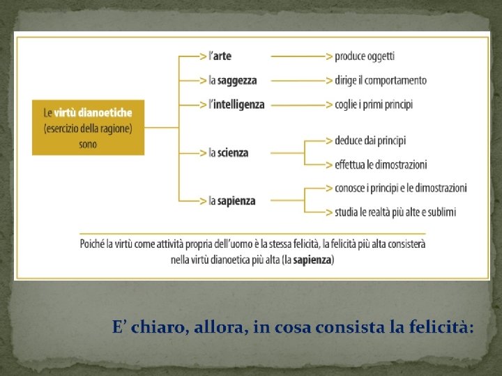 La felicità è definita da Aristotele come attività dell’anima secondo virtù: come ogni parte dell’anima ha una sua attività peculiare, così deve avere una sua peculiare virtù. - L’anima vegetativa, non avendo alcun rapporto con la ragione, non è coinvolta nell’etica, che mette in gioco soltanto le due funzioni superiori dell’anima stessa. - Dall’anima sensitiva dipende la facoltà desiderativa, ovvero la capacità di provare desideri e passioni, di per sé smodati, che deve essere diretta dalla ragione. Ad essa si riferiscono quelle che Aristotele chiama virtù etiche. - Dell’anima razionale sono proprie delle virtù specifiche, quelle che Aristotele chiama virtù dianoetiche.