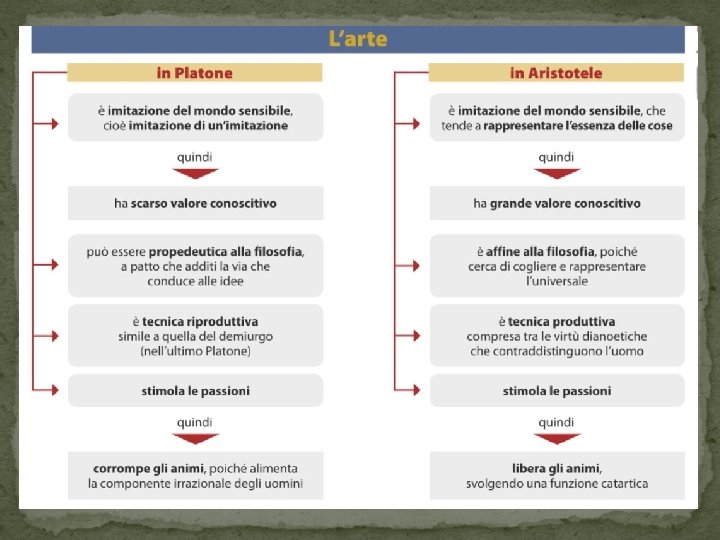La mimesi Platone aveva condannato l’arte imitativa come «mimesi di secondo grado» ; Aristotele si oppone nettamente a questo modo di vedere e considera l’arte non come una passiva riproduzione della realtà ma, al contrario, come un’attività che «ricrea» le cose secondo una nuova prospettiva: