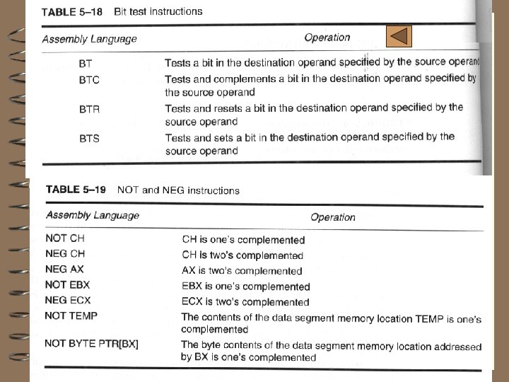 Basic Logic Instruction (cont’d) 4 Test and Bit Test Instruction • Test instruction performs the AND operation; the differece is that the AND instruction changes the destination operand, while the TEST does not • Test instruction affects only the flag (Table 5. 17 and Example 5. 29) • Bit Test instruction tests single bit position (Table 5. 18 and Example 5. 30 4 NOT and NEG • NOT performs logical inversion (1’s complement) and NEG performs arithmetic sign inversion (2’s complement)