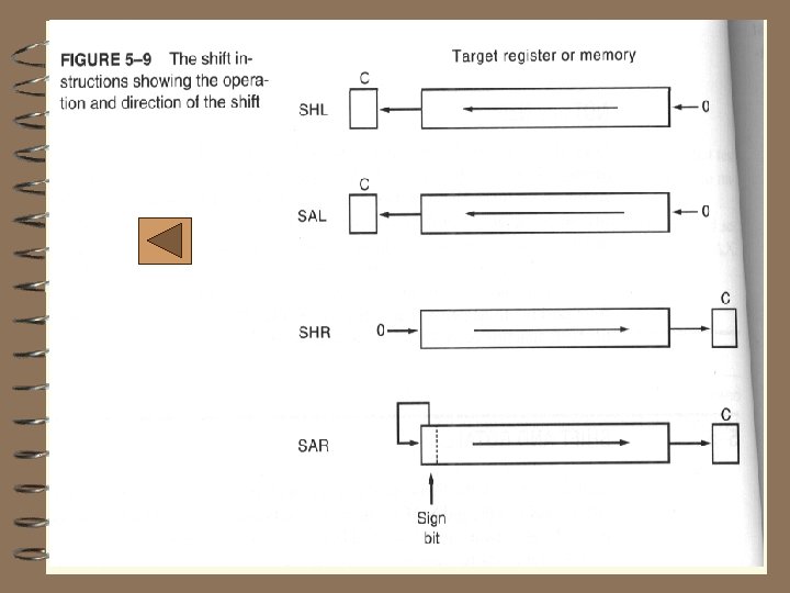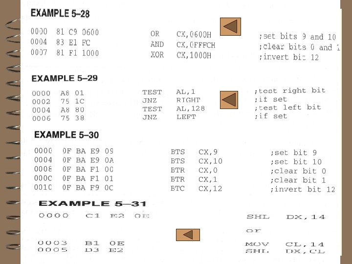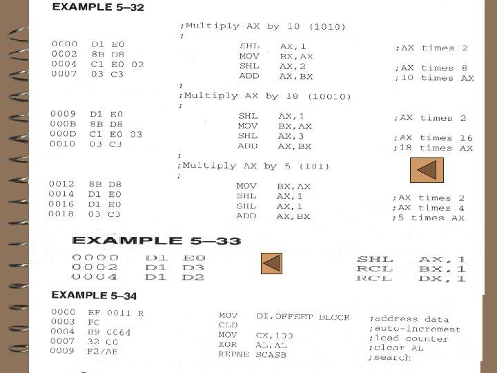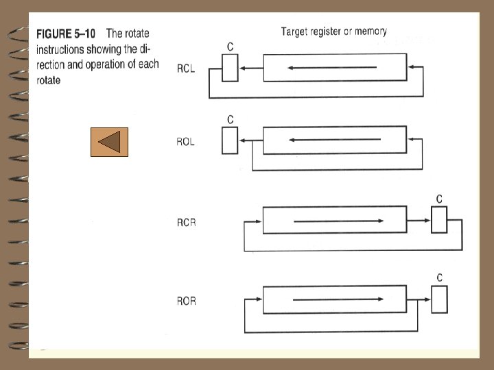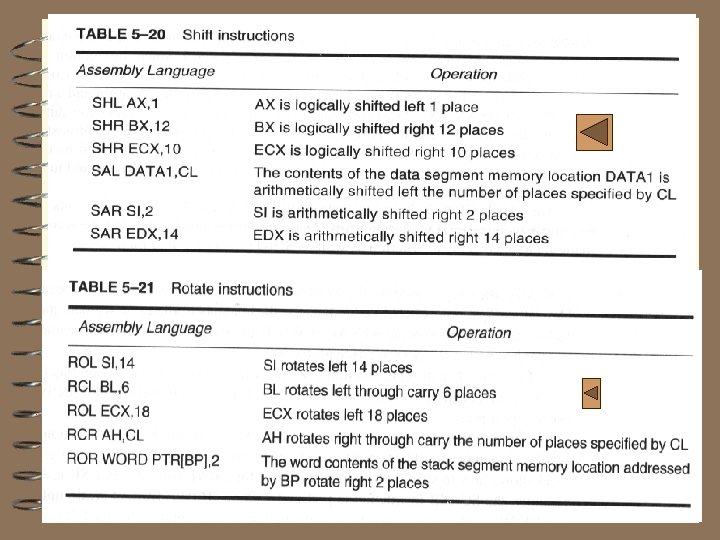 Shift and Rotate (cont’d) 4 Rotate • Rotates position binary data by rotating the infromation in a register or memory location either from one end to another or through the carry flag • Rotates are often used to shift wide numbers to the left or right • Study Fig. 5. 10, Table 5. 21, Example 5. 33 4 Bit Scan Instructions • BSF (bit scan forward) and BSR (bit scan reverse) scan through a number searching for the first 1 -bit encountered