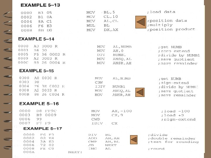 Multiplication and Division (cont’d) – 8 -bit Division • The AX register stores the dividend • After the division, AL contains the quotient and AH contains a whole number remainder • See Table 5. 11, Example 5. 14 & Example 5. 15 – 16 -bit Division • Instead of dividing into AX, the 16 -bit number is divided into DX-AX, a 32 -bit dividend • The qutient appears in AX and the remainder in DX after a 16 -bit division • See Table 5. 12 and Example 5. 16