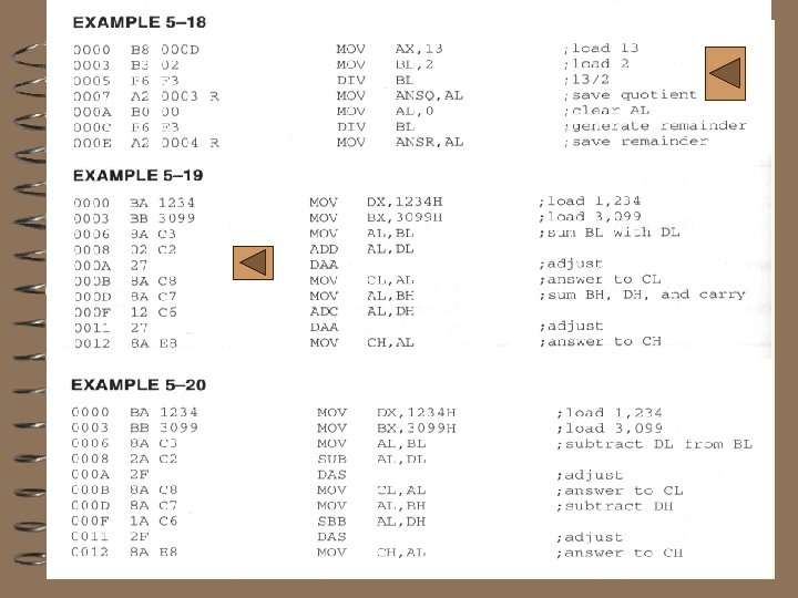 BCD and ASCII Arithmetic 4 BCD Arithmetic p allows arithmetic manipulation of both BCD and ASCII – DAA (Decimal Adjust After Addition) Instruction • It follows the ADD or ADC instruction to adjust the result into a BCD result (Ex. 5. 19) – DAS (Decimal Adjust After Subtraction) Instruction • It functions as does the DAA, except that it follows a subtraction instead of an addition (Ex. 5. 20)
