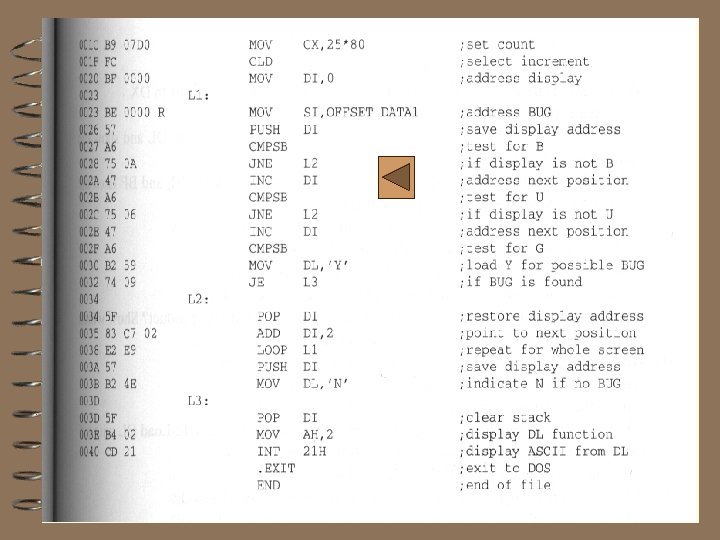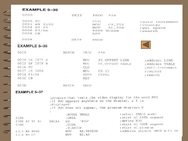 String Comparisons It is very powerful because allows to manipulate large blocks of data with relative ease 4 SCAS – SCAS compares the AL register with a byte block of memory (SCASB), the AX register with a word block of memory (SCASW), or the EAX register with a doubleword block of memory (SCASD) – study Example 5. 34 and Example 5. 35 4 CMPS – It always compares two sections of memory data as bytes (CMPSB), word (CMPSW), or doubleword (CMPSD); Study Example 5. 36