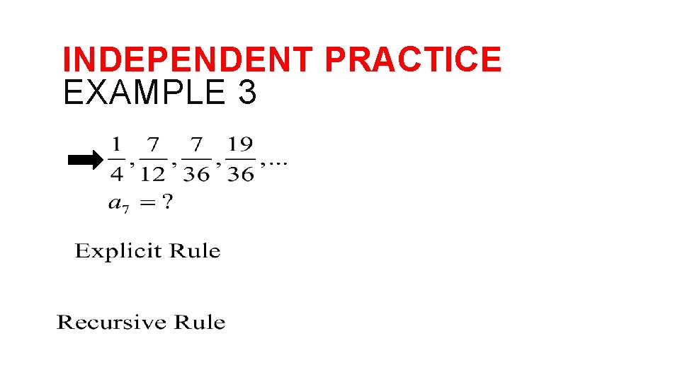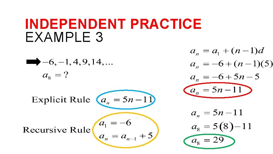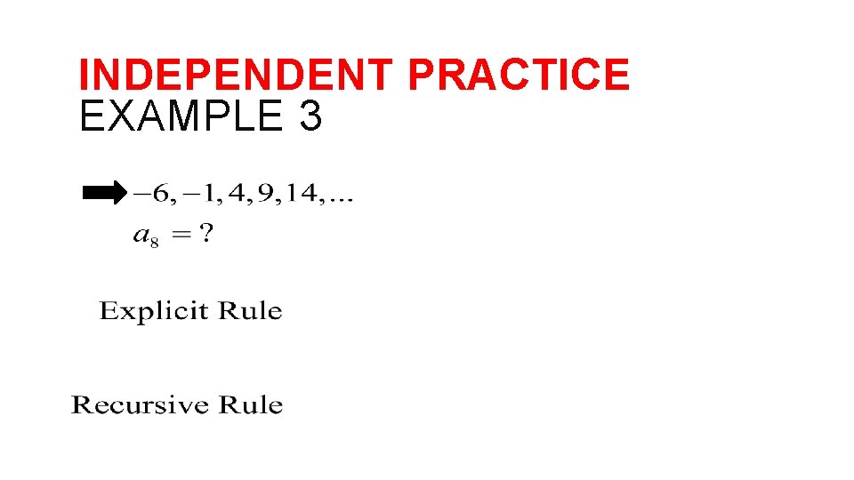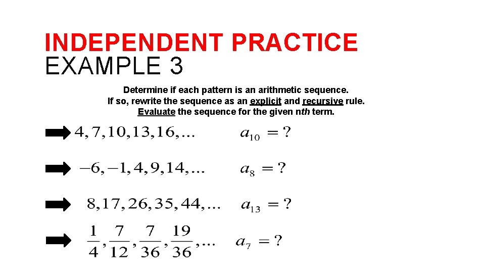 INDEPENDENT PRACTICE EXAMPLE 3 Determine if each pattern is an arithmetic sequence. If so, rewrite the sequence as an explicit and recursive rule. Evaluate the sequence for the given nth term.