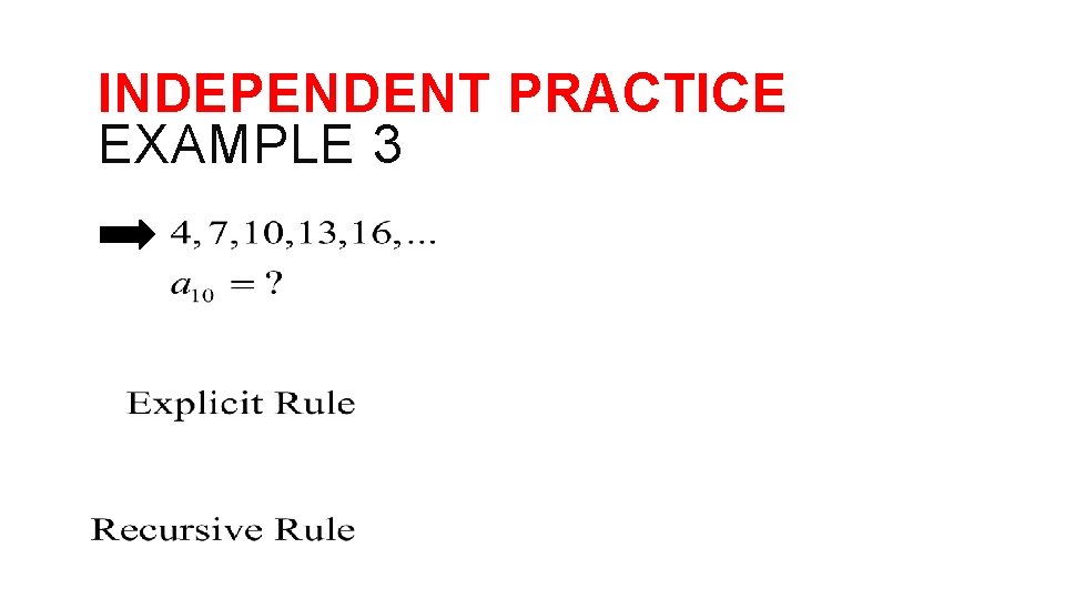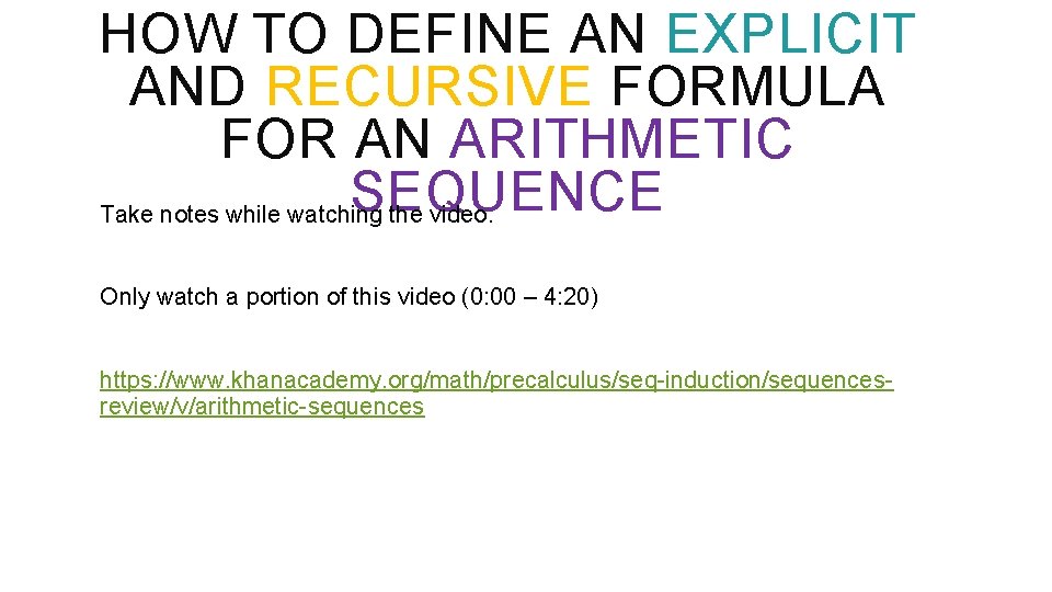 HOW TO DEFINE AN EXPLICIT AND RECURSIVE FORMULA FOR AN ARITHMETIC SEQUENCE Take notes while watching the video. Only watch a portion of this video (0: 00 – 4: 20) https: //www. khanacademy. org/math/precalculus/seq-induction/sequencesreview/v/arithmetic-sequences