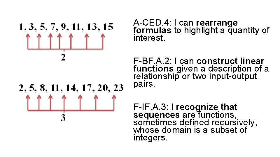 A-CED. 4: I can rearrange formulas to highlight a quantity of interest. F-BF. A. 2: I can construct linear functions given a description of a relationship or two input-output pairs. F-IF. A. 3: I recognize that sequences are functions, sometimes defined recursively, whose domain is a subset of integers.