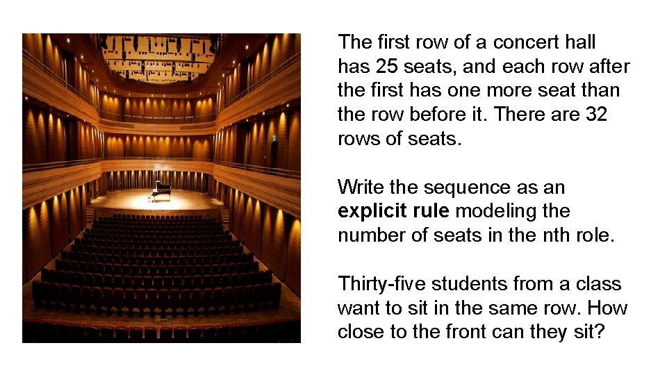 The first row of a concert hall has 25 seats, and each row after the first has one more seat than the row before it. There are 32 rows of seats. Write the sequence as an explicit rule modeling the number of seats in the nth role. Thirty-five students from a class want to sit in the same row. How close to the front can they sit?