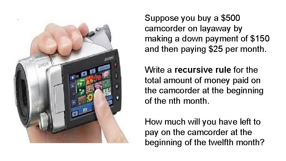Suppose you buy a $500 camcorder on layaway by making a down payment of $150 and then paying $25 per month. Write a recursive rule for the total amount of money paid on the camcorder at the beginning of the nth month. How much will you have left to pay on the camcorder at the beginning of the twelfth month?