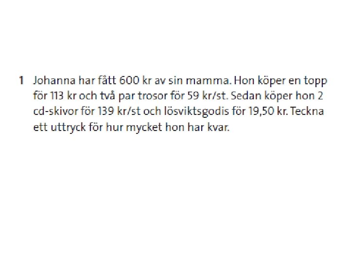 Teckna ett utryck • När du löser matematiska problem i dina karaktersämnen är det bra att kunna förklara hur du har tänkt. • Du ska visa vilken tal och vilka räknesätt du använder. • I matematiken kallas det för att du tecknar uttryck. • När du har tecknat ditt uttryck kan du sedan direkt utföra beräkningen. • Det finns alltid flera sätt att teckna uttryck på.