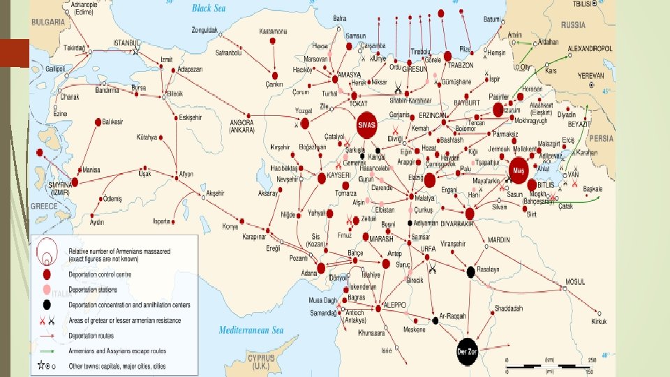 Genocide continues… In June 1915, the Armenian population (2 M) was deported to the deserts of Syria and Iraq. Prior to deportation, all able-bodied males were shot. 25% of those that left Turkey would eventually arrive in Syria and Iraq. The majority of people were either murdered or died of thirst and starvation along the way.