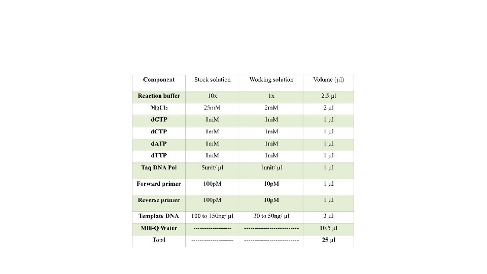 2. Amplification conditions: • The annealing temperature should higher (do not compromise the annealing temperature). • The concentration of the PCR components is given into the table below: