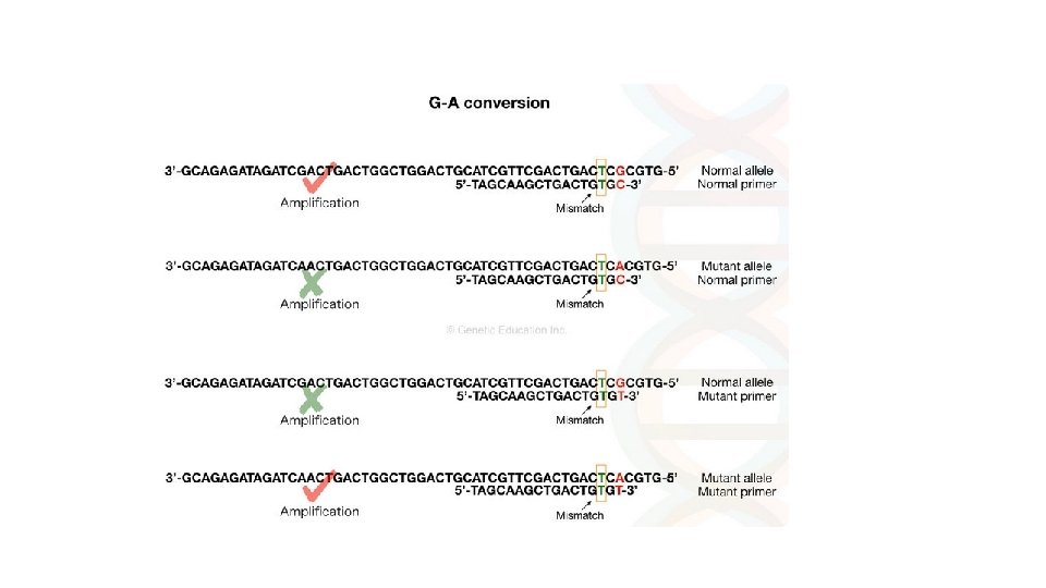 1. Primer designing for ARMS PCR: • The primer must be allele-specific. • Suppose our DNA sequence has G-A point mutation viz, G in normal allele and A in place of G in the mutant allele. We have to design a forward primer in such a manner that for normal allele the primer contains C (complementary to G) at 3’ end and the mutant primer contains T in place of C. • The magic of the present technique has happened when we add a mismatch base near to our SNP at the 3’ end.