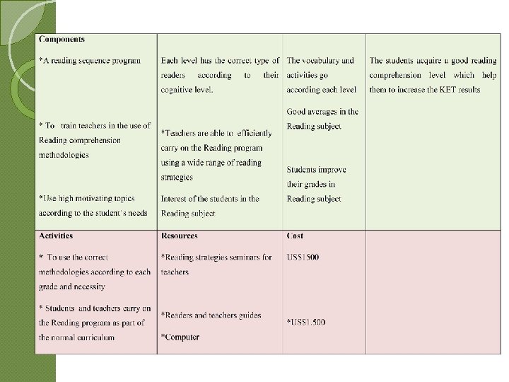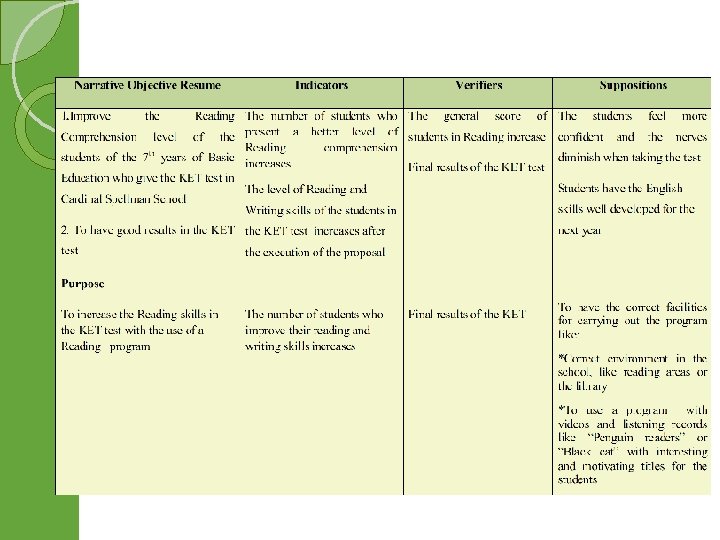 General objectives �To establish a complete program of integrated reading strategies using adequate material as well as the correct approaches and methodologies that increase subsequent reading scores. �To work within the four general skills and thereby improve them so as to have a better percentage of students who pass the KET test. �To determine if the use of Reading Comprehension Strategies increases the reading skill development of girls in Cardinal Spellman Girls´ School during the third term, 2010 – 2011 school year.
