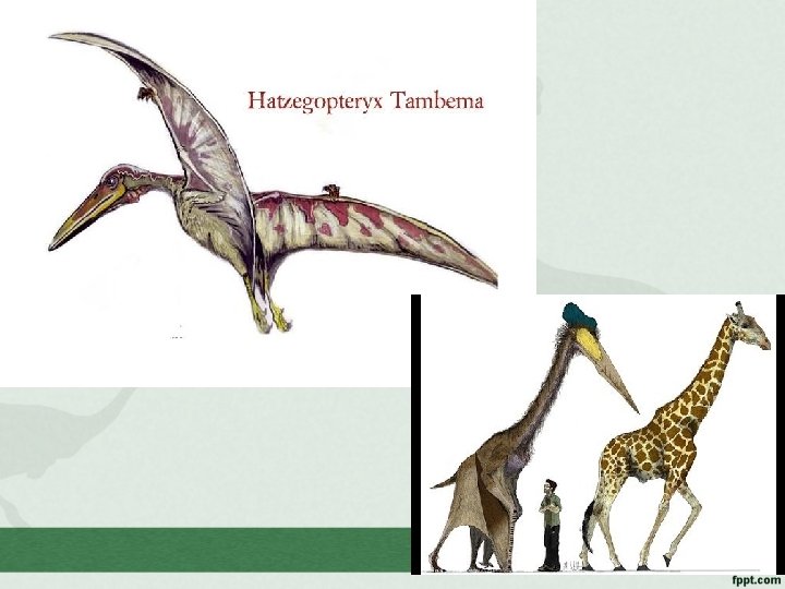 • The Țara Hațegului dinosaurs from our region - dwarfed herbivorous titanosaurs - are world renowned for their small dimensions in comparison to the Cretaceous dinosaurian fauna (e. g. Magyarosaurus). On the lost island of Hateg, there wasn’t enough food to support giant eating dinosaurs and, as a result, the evolution converged to a world of dwarf dinosaurs. However, in 2002 the largest flying vertebrate ever known was discovered. The 10 m wingspan pterosaur with a nearly 3 m long skull. This new dinosaur was named as Hatzegopteryx, hence it was found in Hatzeg.