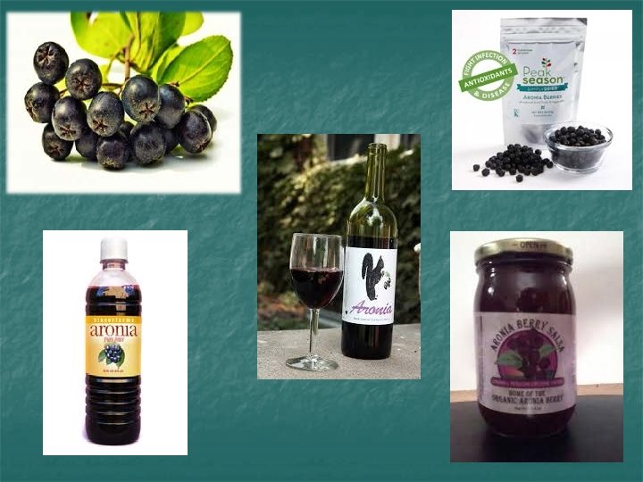 Aronia Marketing n Marketed for high antioxidant content n Fresh berries Strong unusual flavor (like or dislike) n Very astringent, a bitter n Freezing and heating reduce astringency n Jam, juice, tea, baking ingredient, wine n Juice concentrate n Marketed as health tonic n Used for juice blends, wine feedstock n
