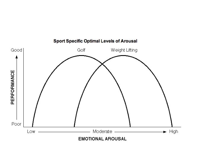 Inverted U Hypothesis (Yerkes and Doson, 1908) Suggests that performance will increase with arousal to an optimum point. • However if you go beyond that point then performance will decrease From observations this seems to fit very well, however, it is too simplistic • Does it apply equally to the different phases of learning? • Does it apply to all sports performance in the same way?