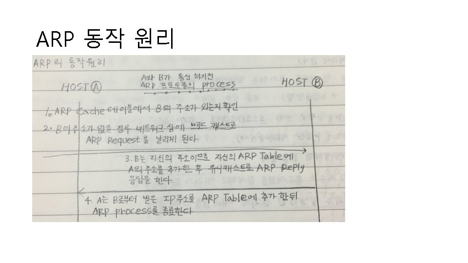 Number Operation Code 1 ARP Request 2 ARP Reply 3 RARP Request 4 PARP Reply <ARP & RARP Operation Code> Packet number 24 Packet number 25 Arp type Request Arp type Reply 송신자 MAC 00: 56: c 0. . 송신자 MAC 00: 56: eb. . 송신자 IP 192. 168. 174. 1 송신자 IP 192. 168. 174. 254 그럼 192. 168. 174. 1 의 MAC은 뭘까? =>00: 56: eb. . 결론 : 각 IP 주소에 해당하는 MAC 주소를 검색하기 위해서 요청하고, 해당 IP 주소를 갖는 호스트는 자신의 MAC 주소를 포함하여 응답한다.