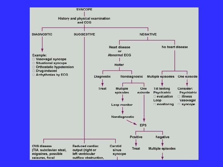 Senkopta Tanısal Yaklaşım 1 - Anamnez 2 - Fizik muayene 3 - Karotis sinüs masajı 4 - Elektrokardiyogram (EKG) 5 - Efor testi 6 - Holter monitor (uzun süreli EKG kaydı) 7 - Tilt table testi 8 - Elektrofizyolojik çalışma 9 - Ekokardiyografi 10 - Koroner anjiografi