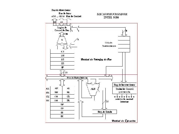 ARQUITECTURA DEL MICROPROCESADOR 8086 En la siguiente figura se ilustra el diagrama de bloques de una CPU algo más compleja que corresponde al microprocesador Intel 8086. Este procesador tiene 16 bits en el bus de datos y 20 bits en el bus de direcciones. Está constituido por dos unidades independientes: la Unidad de Ejecución y la Unidad de Interfaz de Bus. La Unidad de Ejecución (EU) se encarga únicamente de ejecutar instrucciones. Cuenta con una ALU, el Registro de Estado, Registros de Uso General, el Registro de Instrucciones y una Unidad de Control y Secuencia encargada de controlar la ejecución de instrucciones. Tiene una estructura similar a la de la CPU anterior. La Unidad de Ejecución se conecta con la otra unidad a través del bus interno de datos.