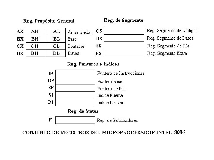 ARQUITECTURA DEL MICROPROCESADOR 8086 Los registros de esta CPU son de 16 bits que en la figura siguiente se han agrupado de acuerdo a las funciones en las que suelen participar. • Los registros de propósito general pueden almacenar cualquier tipo de datos, sin embargo al registro AX se le utiliza frecuentemente como acumulador en las operaciones de la ALU y por eso se le llama Acumulador. • Al registro BX, llamado registro Base, se le utiliza como registro de dirección base; al registro CX, como Contador de ciclos; al registro DX, como puntero de dirección de E/S o registro de Datos. • Los registros punteros e índice sirven para apuntar a direcciones de memoria dentro de cada segmento.