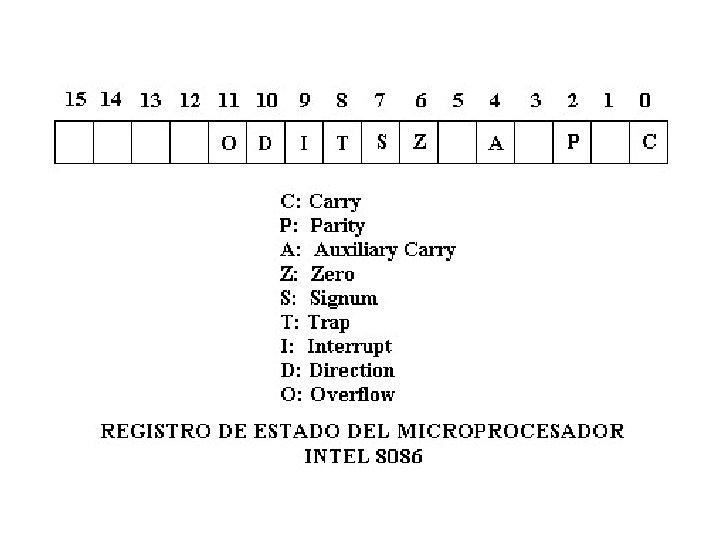 ARQUITECTURA DEL MICROPROCESADOR 8086 Se tienen los siguientes señalizadores: • Carry C: es el acarreo o préstamo ocurrido en el bits más significativo del resultado en la última operación de la ALU. • Parity P: es igual a 1 si el byte menos significativo del resultado de la última operación de la ALU es par, es igual a 0 si el byte es impar. • Auxiliary Carry A: es el acarreo o préstamo en el primer cuarteto en la última operación de la ALU. • Zero Z: es igual a 1 si el resultado de la última operación de la ALU es cero.