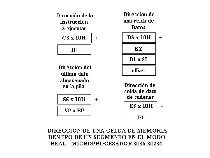 SEGMENTACIÒN DE MEMORIA • La dirección de segmento se encuentra en uno de los registros de segmento y corresponde al inicio de un segmento de memoria de 64 KB. La dirección de desplazamiento selecciona cualquier localidad dentro de este segmento. • Por ejemplo. El segmento de códigos tiene su dirección inicial dentro del registro de segmento de códigos CS. • Como una dirección se especifica en este procesador con 20 bits, el contenido de CS debe multiplicarse por 10 h: CS x 10 h. • Luego se agrega el desplazamiento contenido en el registro IP para obtener la dirección donde empieza la instrucción que se va a ejecutar. Instrucción = CSx 10 h + IP