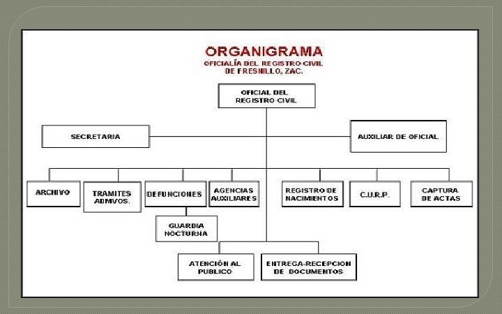 PROVEEDORES VISTA HORIZONTAL DEL REGISTRO CIVIL DE FRESNILLO OFICIALÍA DEZAC. REGISTRO CIVIL Trámites administrativos Secretaria Registro de nacimientos Atiende a usuario que solicita curp Auxiliar de oficial Gobierno federal Coordina Recursos financieros CURP Oficial del registro civil Coordina Proveedores Recursos materiales CLIENTES Entrega recepción de documentos Atención al público Archivo Captura de actas Asentar registros de defunción Agencias auxiliares Defunciones Guardia nocturna Comunidad Atiende