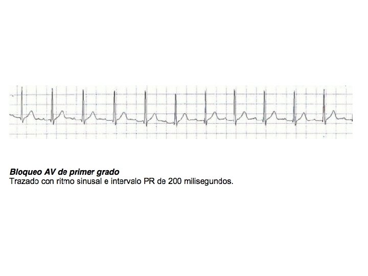 BLOQUEO 1 er GRADO • El bloqueo AV de primer grado es un retraso en la conduccio n en el nodo AV y se manifiesta en el ECG por una prolongacio n anormal del intervalo PR. En la mayori a de los casos no existe patologi a cardi aca asociada. La causa ma s frecuente es un incremento del tono vagal. En estos casos, basta poner el paciente de pie para normalizar el PR. Tambie n se observa en trastornos hidroelectroli ticos, hipotermia, fiebre reuma tica, distrofia muscular, y en algunas cardiopati as conge nitas como CIA tipo ostium primum (Fig. 43). • Tratamiento: no.