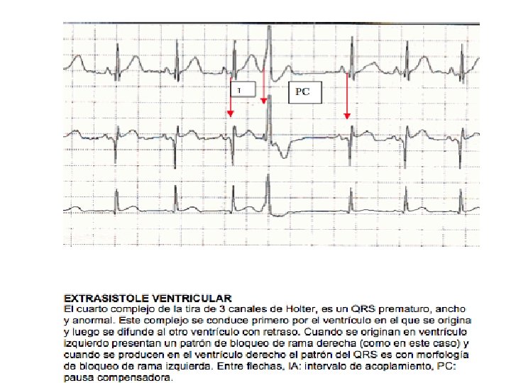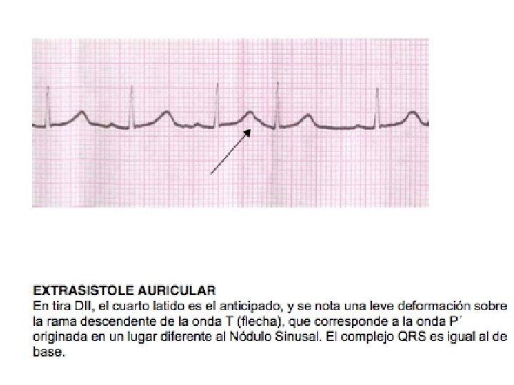 EXTRASISTOLES AURICULARES • Las extrasi stoles auriculares son latidos precoces que nacen en cualquier parte de la auri cula. La onda P tiene diferente morfologi a y eje ele ctrico, el intervalo PR puede estar normal o prolongado y la conduccio n A-V (hacia los ventri culos) puede ser normal, aberrante (con bloqueo de rama) o estar bloqueada , y esto va a depender en que momento se encuentre el peri odo refractario del no dulo auri culo ventricular. La onda P de la extrasi stole puede ser de dificultosa identificacio n, dado que puede estar incluida dentro de la onda T del complejo precedente. • Las extrasi stoles auriculares se presentan en carditis reuma tica, hipertiroidismo, , trastornos metabo licos (hipoglucemia, hipokalemia, hipercalcemia) o hipo xicos, durante la infusio n de fa rmacos como los estimulantes beta, antidepresivos, intoxicacio n digita lica, asi como la presencia de elementos endocavitarios exo genos(cate teres, vi as centrales) o endo genos(tumores). • Tratamiento: no, tratar la causa subyacente.