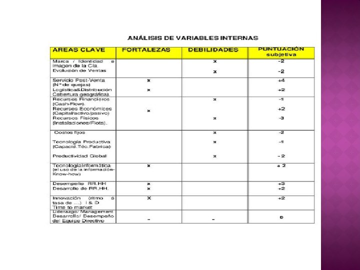 � En la evaluación interna lo que se busca es una confrontación más realista posible entre el presente sobre la situación actual de la empresa con sus procesos internos tales como capacidades de: innovar, crecimiento y/o gestión de RRHH en comparación con las mismas variables pero de la competencia y descubrir los puntos débiles (DEBILIDADES) en que estamos fallando para mejorar y por otro lado buscar también las capacidades o fortalezas (FORTALEZAS) con que cuenta la Empresa para aprovechar los oportunidades. -
