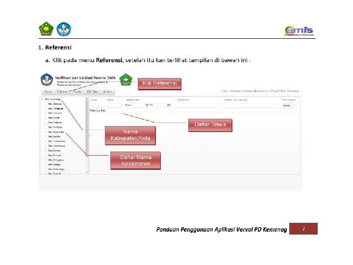 HOME REFERENSI RESIDU EDIT DATA KONFIRMASI DATA SYSTEM MENU AWAL LAMAN/WEBSITE YANG MENAMPILKAN PERBANDINGAN DATA REFERENSI & RESIDU MENU YANG MENAMPILKAN REKAP DATA SISWA YANG SUDAH VALID MENU UNTUK MEMPROSES ATAU MEMVERIFIKASI-VALIDASI DATA SISWA YANG BELUM VALID MENU UNTUK MERUBAH/KOREKSI DATA REFERENSI SISWA MENU UNTUK MENGKONFIRMASI DATA YANG TELAH DI VERIFIKASI–VALIDASI SUPAYA DATA DI REFERENSI VERVAL PD, DAPODIK, DAN ARSIP PDSP MENJADI VALID/SAMA PERSIS MENU UNTUK KELUAR DARI LAMAN (LOG OUT)