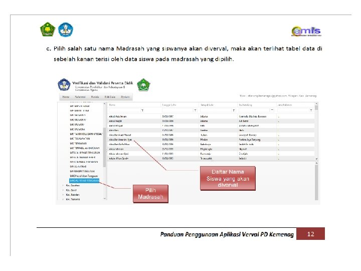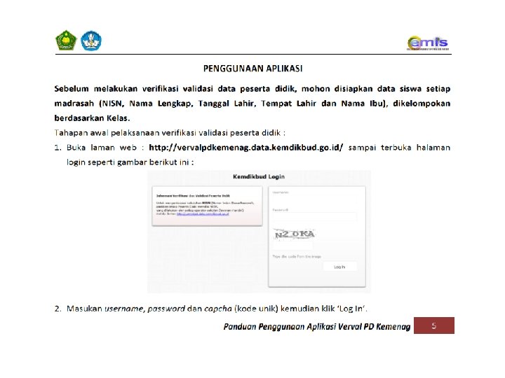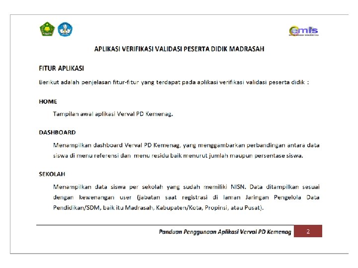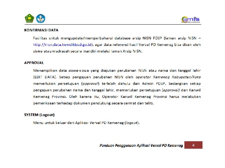 URUTAN PENGERJAAN APLIKASI VERVAL PD KEMENAG 1. RESIDU 2. KONFIRMASI DATA 3. EDIT DATA RESIDU HARUS HABIS, SELURUH SISWA HARUS MEMILIKI NISN. SELURUH NISN DATA SISWA HARUS DIKONFIRMASI KEBENARANNYA, BAIK DATA TERINDIKASI SAMA ATAU BERBEDA. HANYA DIGUNAKAN JIKA DIPERLUKAN KOREKSI. DAN HANYA BISA DILAKUKAN JIKA MEMILIKI DOKUMEN PENDUKUNG YANG SESUAI. EDIT DATA YANG BISA DILAKUKAN DARI APLIKASI VERVAL PD : 1. EDIT/PERUBAHAN NISN 2. EDIT/PERUBAHAN NAMA SISWA 3. EDIT/PERUBAHAN TANGGAL LAHIR SISWA SELAIN 3 (TIGA) VARIABEL DI ATAS, EDIT/PERUBAHAN HARUS DILAKUKAN DARI APLIKASI EMIS. HAL-HAL LAIN YANG PERLU DIPERHATIKAN : 1. DATA SISWA DI APLIKASI VERVAL PD MERUPAKAN DATA HASIL SINKRONISASI DARI APLIKASI EMIS. 2. TIDAK ADA MENU UNTUK MENAMBAH/MENGURANGI SISWA DI VERVAL PD KEMENAG, PENAMBAHAN ATAU PENGURANGAN SISWA DILAKUKAN MELALUI APLIKASI DAPODIK (INSERT/DELETE + SINKRONISASI). 3. PROSES SINKRONISASI DARI APLIKASI EMIS KE VERVAL PD MEMERLUKAN WAKTU MAX. 1*24 JAM. 4. DATA EMIS DAN ARSIP PDSP TIDAK AKAN TERUPDATE JIKA TIDAK DILAKUKAN KONFIRMASI DATA.