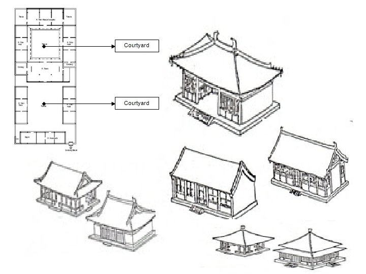PHILOSOFI ARSITEKTUR CHINA 1. Halaman di daerah utara biasanya dibuka dan menghadap selatan yang memungkinkan pencahayaan alami yang lebih maksimal dan menjaga angin utara yang dingin. Konstruksinya relatif kecil dan berfungsi untuk menampung air hujan dari atas atap, ini mirip dengan impluviums Romawi, dan untuk membatasi jumlah sinar matahari yang masuk ke gedung dan sebagai ventilasi untuk pertukaran udara. 2. Bangunan yang menghadap ke selatan di bagian belakang bersifat pribadi dengan pencahayaan sinar matahari yang lebih tinggi, dikhusukan untuk anggota keuarga yang lebih tua atau untuk kamar leluhur. Bangunan menghadap ke timur dan barat umumnya untuk anggota yang keluarga yang lebih muda, sedangkan bangunan di dekat bagian depan biasanya untuk pegawai dan pembantu. 3. Bangunan yang menghadap ke depan di belakang komplek digunakan terutama untuk kamar perayaan ritual dan untuk penempatan ruang leluhur. Dalam beberapa kompleks halaman, halaman tengah dan bangunannya dianggap lebih penting daripada sekelilingnya, yang terakhir biasanya digunakan sebagai tempat penyimpanan atau kamar budak atau dapur.
