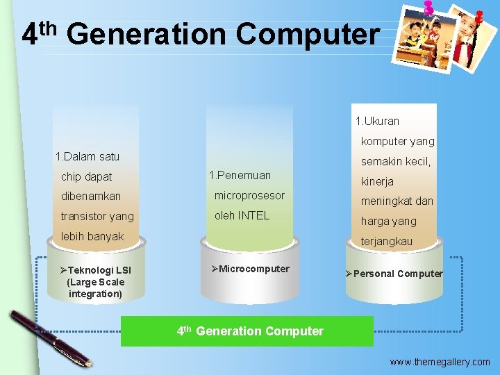 th 4 Generation Computer 1. Ukuran komputer yang 1. Dalam satu chip dapat semakin kecil, 1. Penemuan dibenamkan microprosesor transistor yang oleh INTEL lebih banyak ØTeknologi LSI (Large Scale integration) kinerja meningkat dan harga yang terjangkau ØMicrocomputer ØPersonal Computer 4 th Generation Computer www. themegallery. com