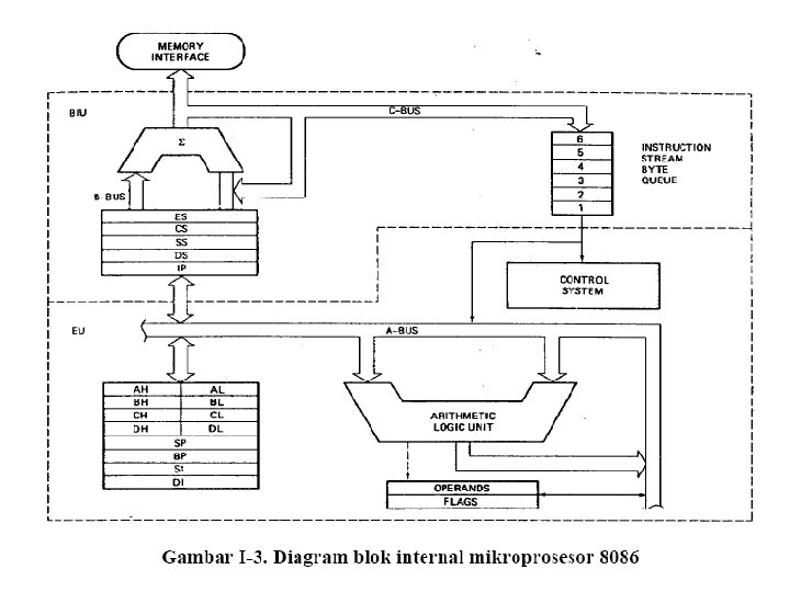• Intel 8086 adalah mikroprosesor 16 bit, di mana dia dapat bekerja secara internal menggunakan operasi 16 bit dan secara eksternal dapat mentransfer data 16 bit melalui bus data. • Prosesor 8086 dapat dihubungkan dengan bus alamat yang berukuran 20 bit, sehingga mampu mengalamati memori maksimal 220 = 1. 048. 576 byte (1 MB). • Diagram blok arsitektur 8086 dapat dilihat pada Gambar I-3. Mikroprosesor 8086 terbagi atas 2 unit, yaitu unit antarmuka bus (bus interface unit, BIU) dan unit pengeksekusi (execution unit, EU).