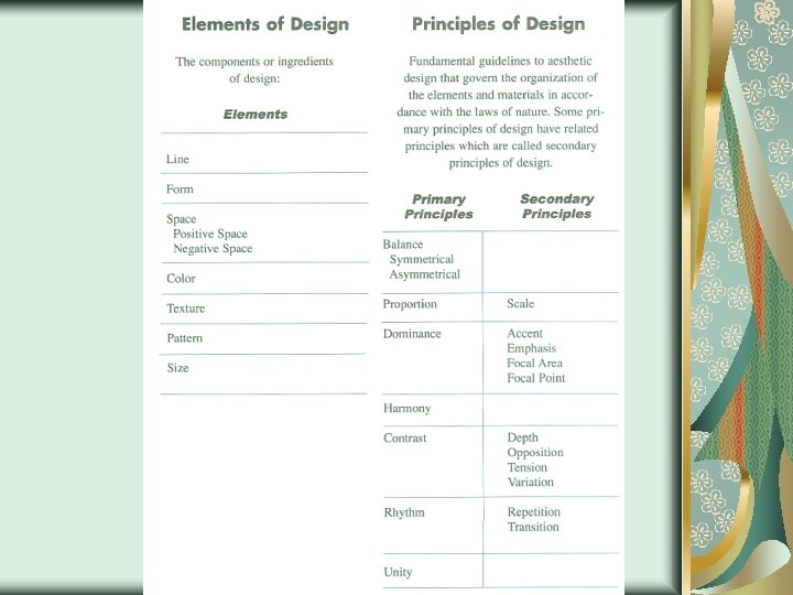 Floral Design as Art Using flowers as an art medium we can create works of art that include elements of design. Elements of design are basic visual symbols in art. We use these words to describe the parts of a work of art. Line Shape & Form Space & Depth Color & Value Texture A work of art can contain all or some of these elements.