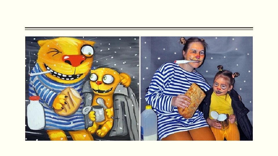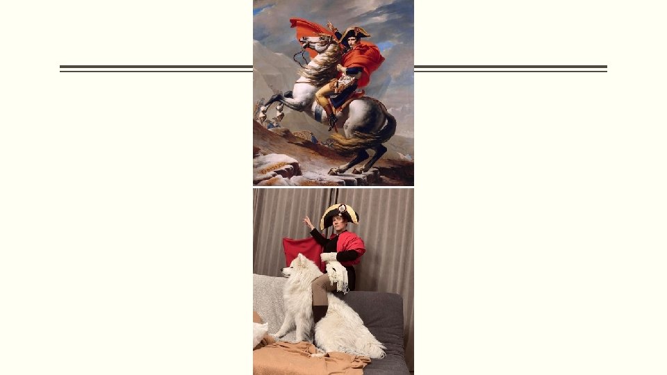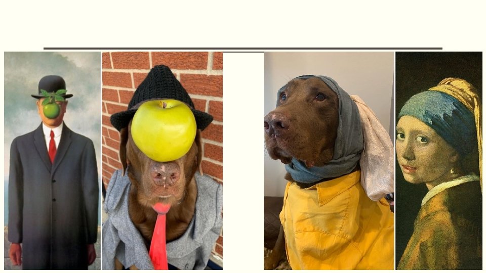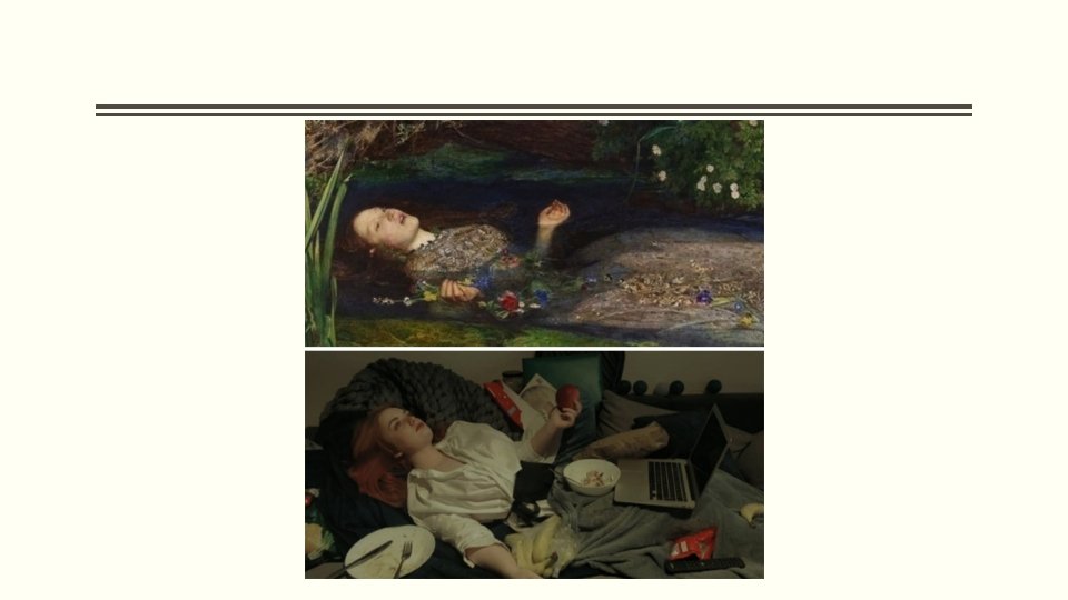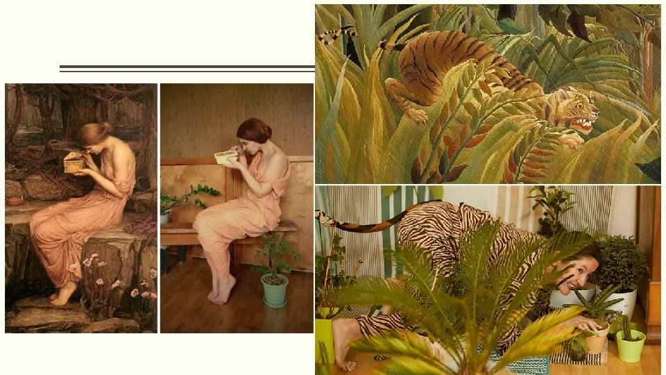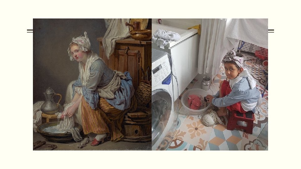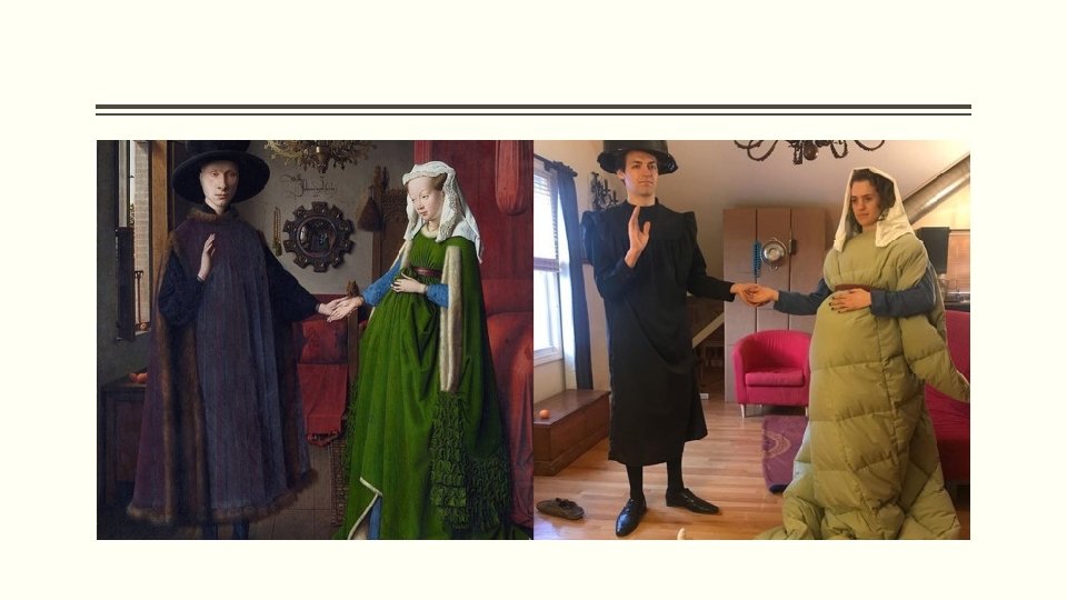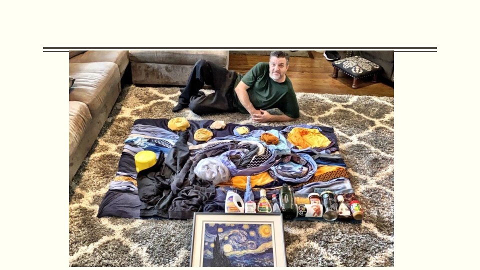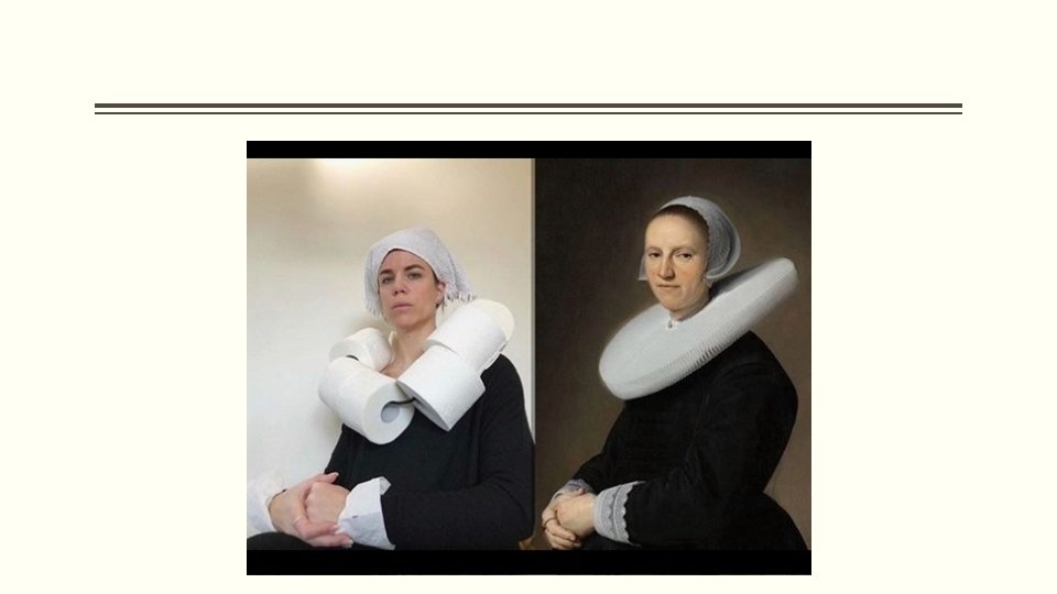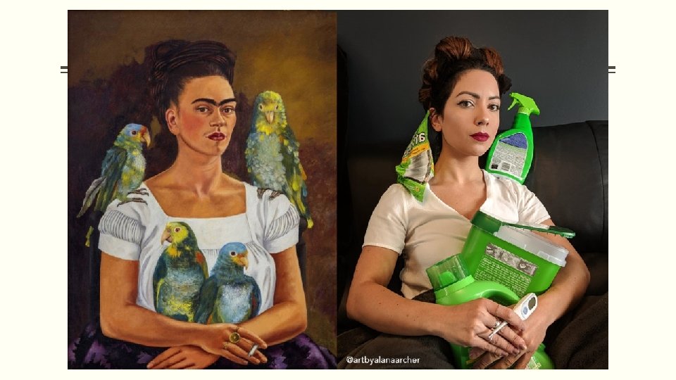 Part 2: #Isolation Art Challenge Watch the video on the next slide about the Isolation Art Challenge that has been flooding social media. ● View several examples on the following slides. ● Recreate a piece of artwork. (It does not have to be the original artwork that you picked for Step 1). ● The artwork can be a portrait (meaning, you would need humans or yourself to pose), a still life, a landscape etc. ● You can use any materials- people, laundry, household objects, etc. ● Be creative and have fun! ● When posting your picture, please post both the original photo and your recreation. You could also do a side-by-side in a Word document or in a Pic Jointer app. Step 2 is also due on Monday, May 11 th prior to the start of class. ●