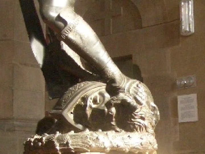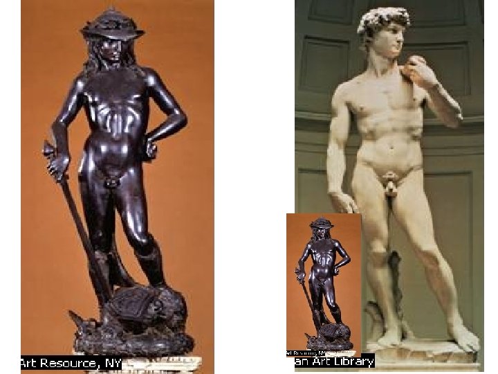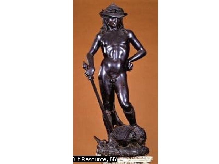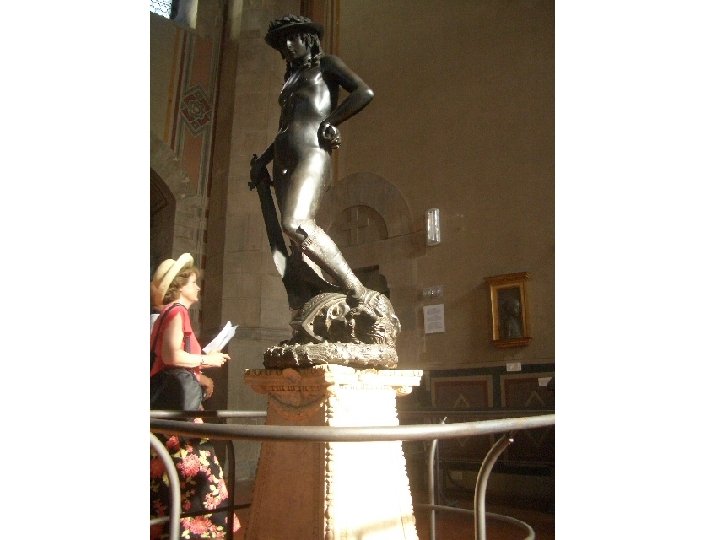 Artist: Donatello Art: The David Medium: Bronze Sculpture 1. 2. 3. 4. Early-Renaissance (1400 s) Life size Looks like a real boy, like David was First free standing nude statue since Roman times 5. Standing on head of Goliath