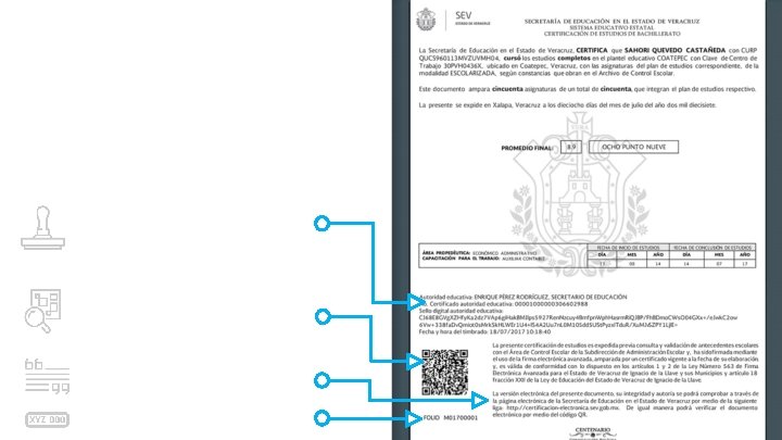 El código QR se encuentra en la parte inferior izquierda del documento. Es necesario instalar una App de lectura de QR, puede ser cualquiera de las que existen en Google Play para Android, la App Store para Apple, en la tienda oficial de Microsoft para los dispositivos con Windows 10. v http: //certificacion-electronica. sev. gob. mx Place your screenshot here