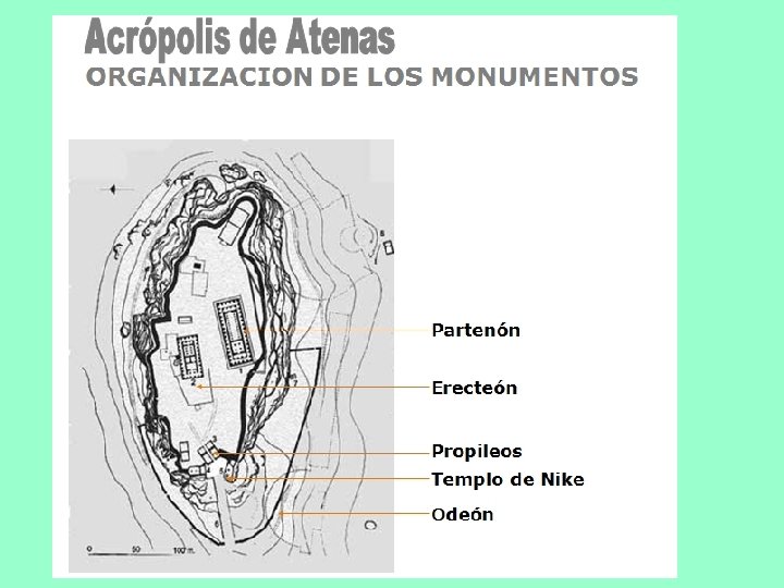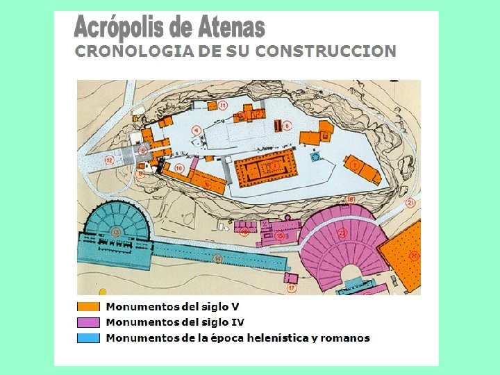 1 Parthenon 2 Old Temple of Athena 3 Erectheum 4 Statue of Athena Promachus 5 Propylaea 6 Temple of Athena Nike 7 Eleusinion 8 Sanctuary of Artemis Brauronia 9 Chalkotheke. 10 Pandroseion 11 Arrephorion 12 Altar of Athena 13 Sanctuary of Zeus Polieus 14 Sanctuary of Pandion 15 Odeum of Herodes Atticus 16 Stoa of Eumenes 17 Sanctuary of Asclepius 18 Theatre of Dionysus Eleuthereus 19 Odeum of Pericles 20 Temenos of Dionysus Eleuthereus 21 Aglaureion Elementos de la Acrópolis