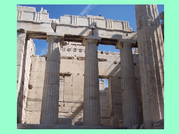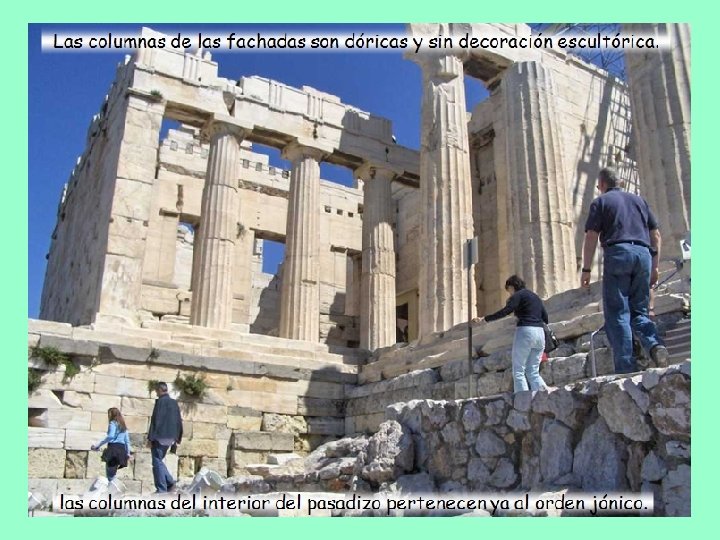 Puertas monumentales de acceso a la Acrópolis Su construcción comienza el año 437 a JC El autor fue Mnesicles