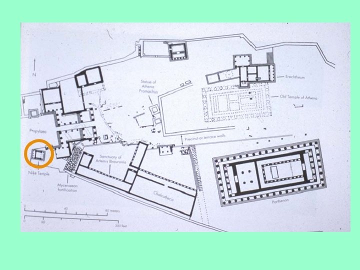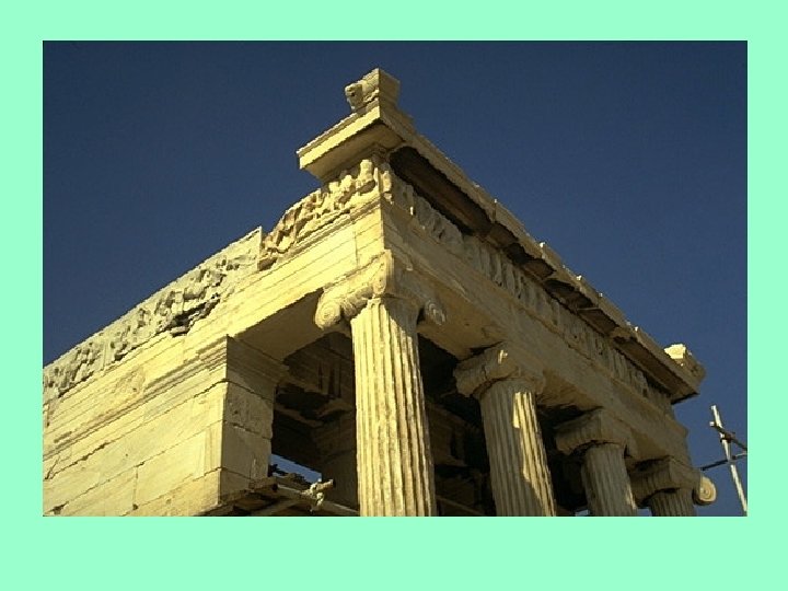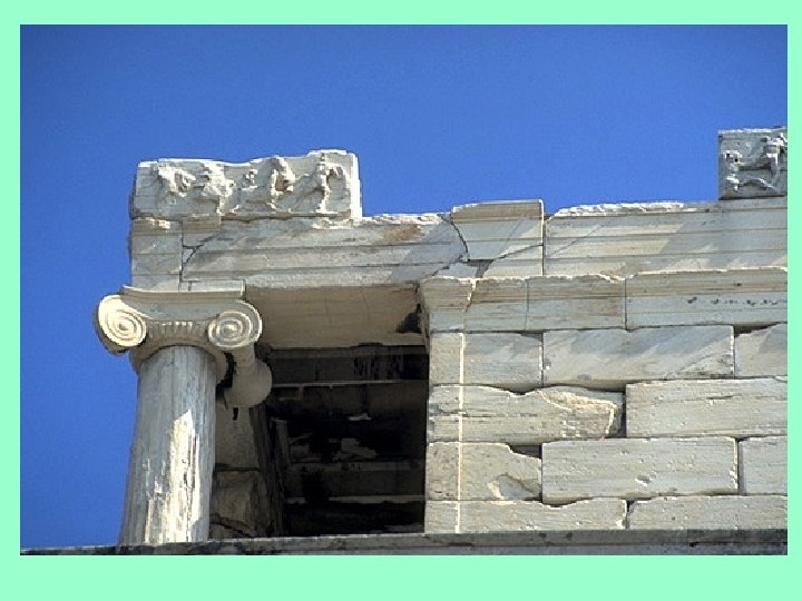 • Niké Áptera (entre el 449 –diseño- y el 425 -21 AC– construcción) • Su autor es Calícrates. • Es un templo pequeño de estilo jónico • Está a la entrada, por lo que su impacto visual es alto ya desde la vía sagrada de acceso. • Tiene unos altorrelieves en el friso de una belleza extraordinaria, representando a la diosa Victoria (Niké) y escenas de la victoria de Platea sobre los persas. • Anfipróstilo (pórtico de columnas en ambas fachadas), y tetrástilo (cuatro columnas). La cella es pequeña: 5 x 5 metros aproximadamente.