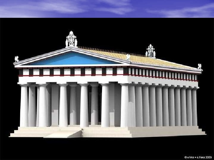 • Cuando a partir de los siglos VIII y VII a. C. comenzaron a labrar estatuas de dioses, sintieron la necesidad de custodiarlas en un relicario, y en eso se convirtió el templo griego: en la MORADA DE LA IMAGEN DEL DIOS. • De aquí se desprende una primera característica del mismo: EL TEMPLO NO DABA COBIJO A LOS FIELES, por lo tanto, no tiene apenas espacio interior y PREDOMINA EL CUIDADO DE SU ENVOLTURA EXTERNA.