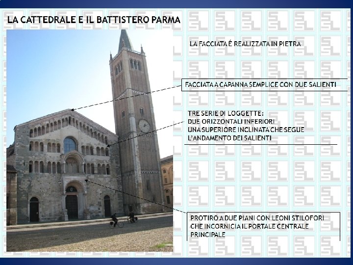 Complesso architettonico di Parma Analogamente a Pisa il complesso architettonico di Parma, stilisticamente omogeneo è costituito da: cattedrale, battistero, campanile e palazzo vescovile 1090 ca-1130