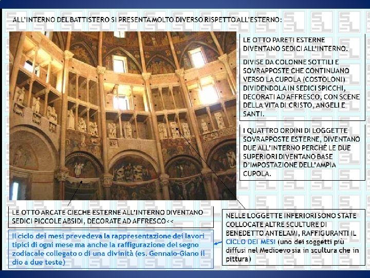 • Il matroneo si affaccia sulla navata centrale attraverso trifore. • Gli archi sono a tutto sesto. • L’alto presbiterio presenta, anteriormente, un divisorio detto pontile.