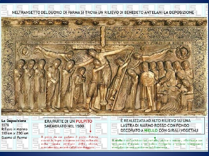 I bassorilievi della Cattedrale di San Geminiano a Modena • Wiligelmo è stato uno scultore di epoca romanica. • Lavorò alla decorazione scultorea della facciata della Cattedrale di Modena, realizzandone i bassorilievi. • Questi ultimi raffigurano alcuni episodi della Genesi e sono stati realizzati nel periodo compreso tra il 1099 e il 1106. • La Genesi è il primo dei 46 libri che compongono l’Antico Testamento.