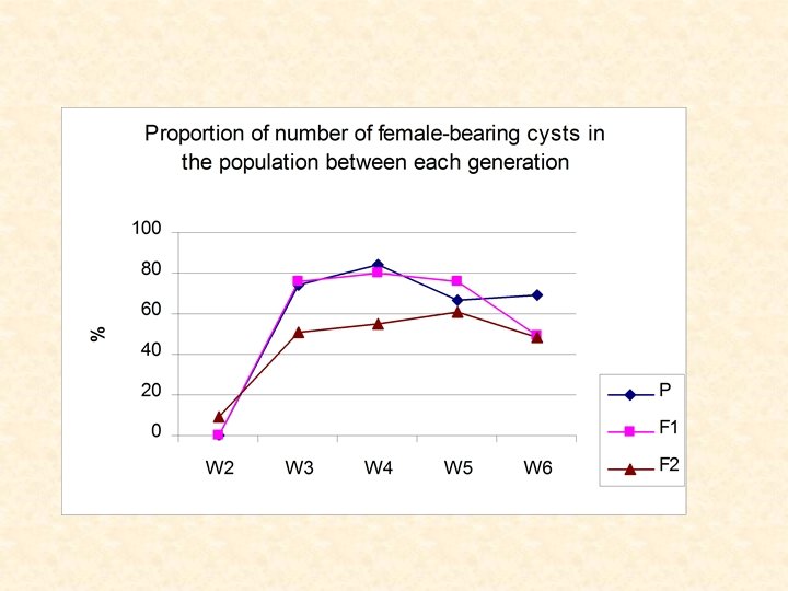 The cyst yields: (kg/ha/5 week) 1999 -2000 2000 -2001 2001 -2002 Parent 60. 06 53. 01 24. 58 F 1 68. 84 46. 2 5. 43 F 2 81. 07 20. 98 28. 75 F 3 12. 47 The cyst yields were largely changed over years, beside the unknown factors that need to be investigated (environment stress, genetics…). Other factors also might influence to cyst production included: